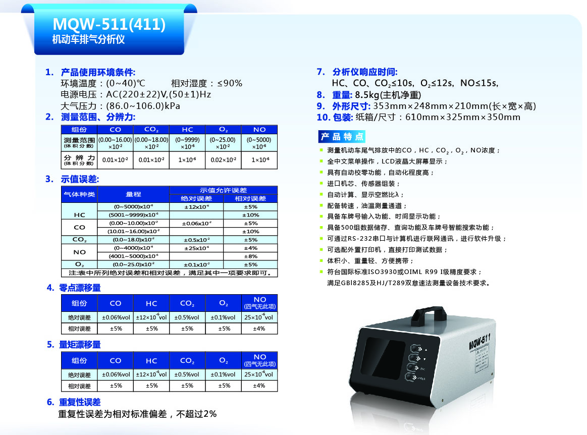 便攜式設計,符合國標ISO 3930和國際OIML R99 0級精度;可多模式雙怠速檢測汽車排氣中的HC、CO、CO2、O2、NO濃度值;高亮度大屏幕液晶顯示,按鍵/菜單對應式一鍵引導操作;可進行天然氣(CNG)、液化氣(LPG)、乙醇等多燃料車輛檢測;具備車牌號輸入/時間顯示和700組數(shù)據(jù)信息存儲??蛇M行U盤數(shù)據(jù)移動存儲和適時的數(shù)據(jù)通訊傳輸功能;標配感應式轉(zhuǎn)速測量鉗;具備3分鐘預熱快速測量功能。