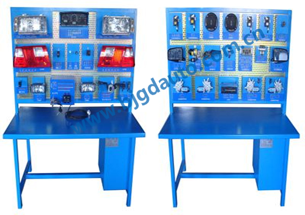 設(shè)備采用原車電器系統(tǒng)部件,包括:照明系統(tǒng)、儀表系統(tǒng)、信號系統(tǒng)、音響系統(tǒng)、玻璃清潔系統(tǒng)、中控門鎖、玻璃升降器、電動后視鏡、汽車喇叭、發(fā)動機電控系統(tǒng)等。各系統(tǒng)按功能劃分,制作為“舒適系統(tǒng)實訓(xùn)臺”、“燈光信號系統(tǒng)實訓(xùn)臺”、“發(fā)動機電控系統(tǒng)”三個臺架。“舒適系統(tǒng)實訓(xùn)臺”包括20個模塊,“燈光信號系統(tǒng)實訓(xùn)臺”包括17個模塊,“發(fā)動機電控系統(tǒng)實訓(xùn)臺”包括27個模塊,臺架采用獨立模塊組合結(jié)構(gòu),輔助機件包括:組合掛板、組合機架、電源、彩色插接線等。