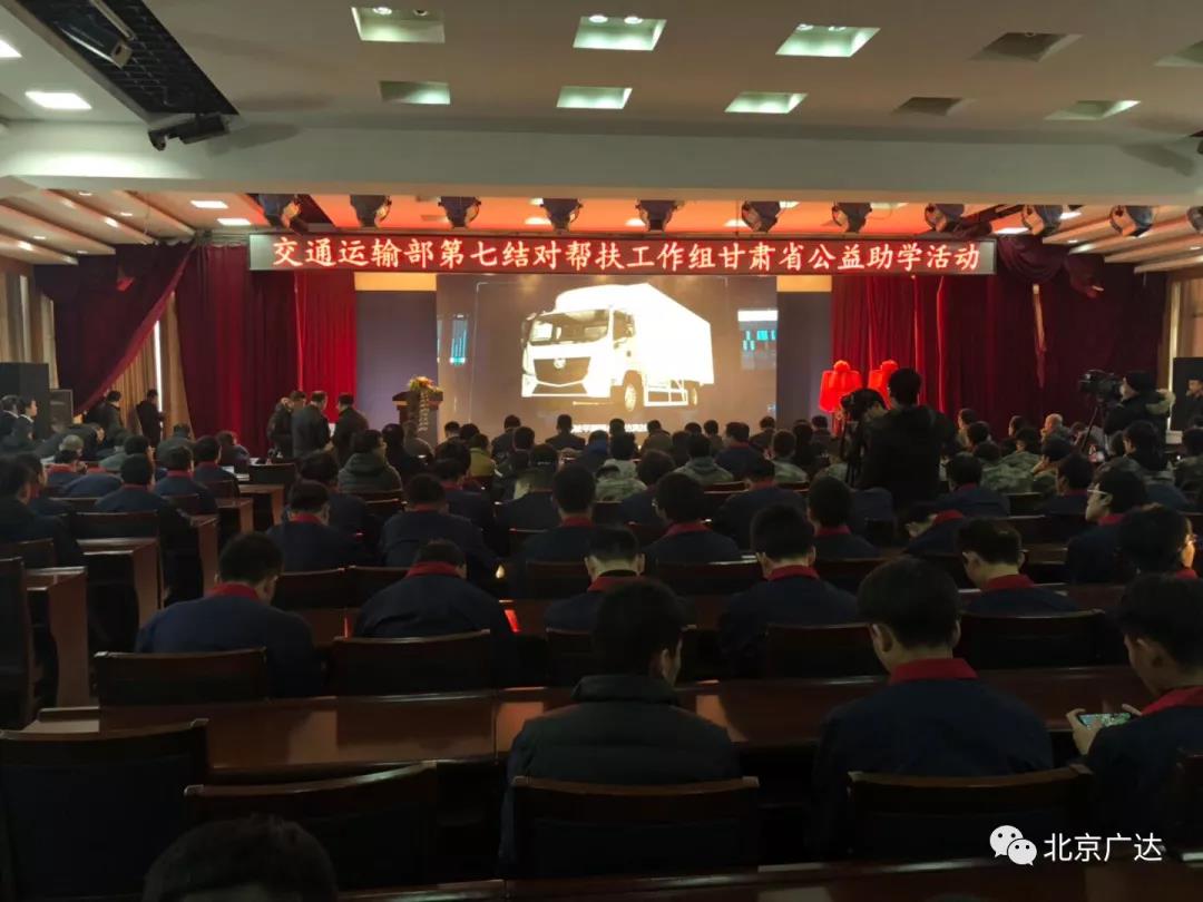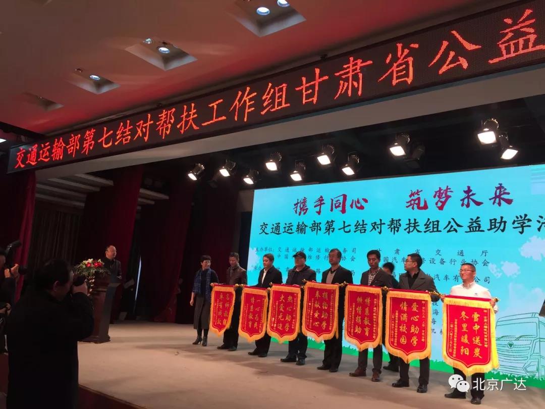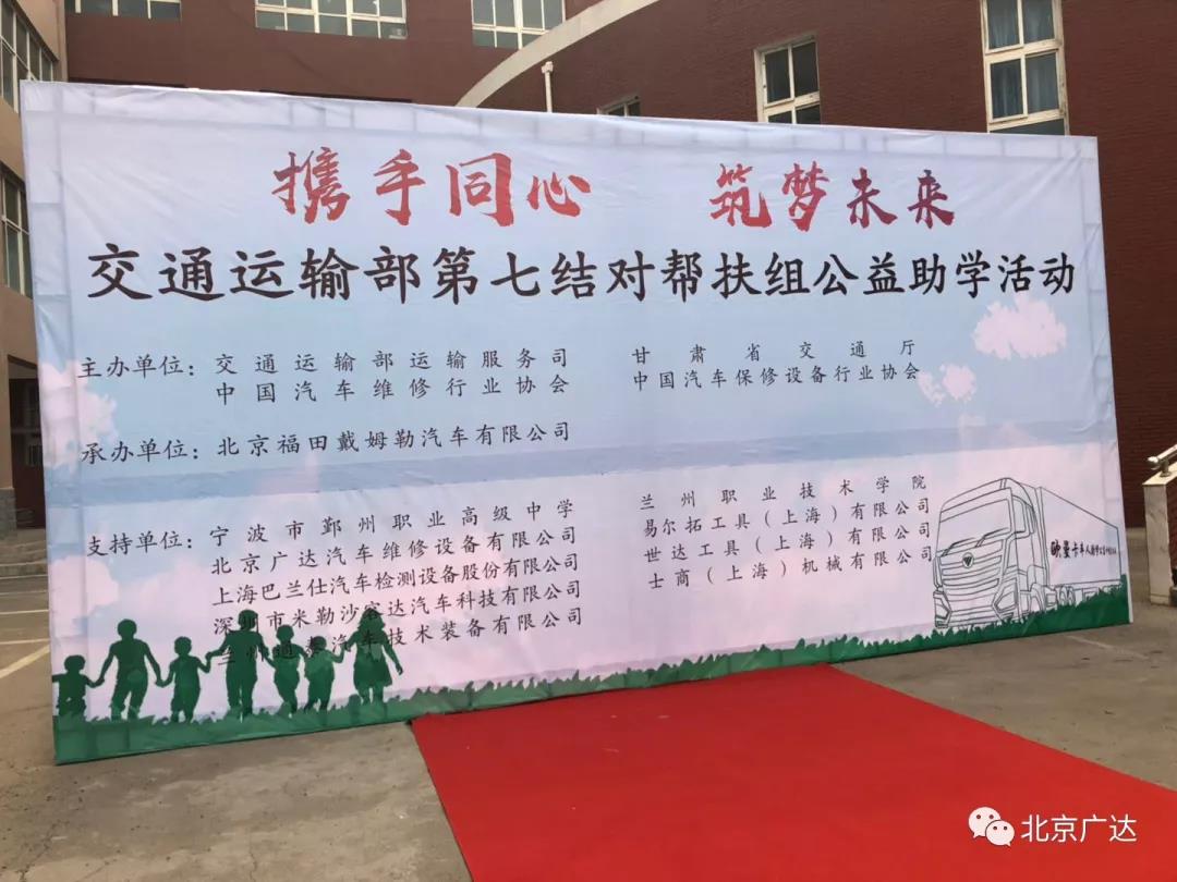 交通運(yùn)輸部第七結(jié)對(duì)幫扶組公益助學(xué)活動(dòng)成功舉辦。交通運(yùn)輸部運(yùn)輸服務(wù)司、甘肅省交通廳、中國(guó)汽車維修行業(yè)協(xié)會(huì)、中國(guó)汽車保修設(shè)備行業(yè)協(xié)會(huì)共同主辦的“攜手同心,共筑未來”交通運(yùn)輸部第七結(jié)對(duì)幫扶組公益助學(xué)活動(dòng)2018年12月14日在蘭州職業(yè)技術(shù)學(xué)院隆重召開,北京廣達(dá)汽車維修設(shè)備有限公司等六家協(xié)會(huì)會(huì)員單位,代表首批捐資助學(xué)企業(yè)出席了本次活動(dòng)。